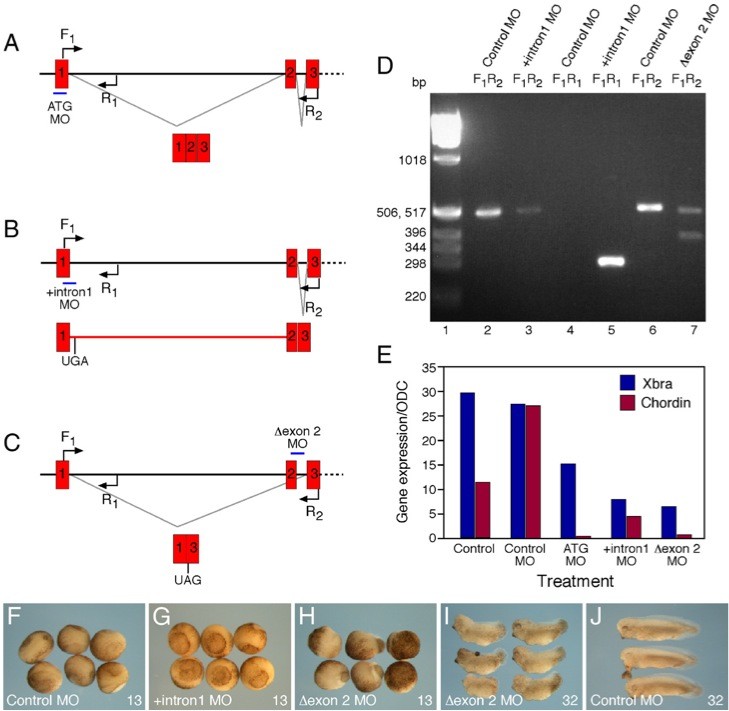 Fig. 7. Antisense morpholino oligonucleotides designed to interfere with the correct splicing of X. tropicalis NRH1 RNA cause down-regulation of Xbra and Chordin and morphological defects that resemble those caused by MOs designed to inhibit NRH1 translation. (A) The first three exons (of a total of six or seven) of X. tropicalis NRH1. The figure shows the position of the MO designed to interfere with NRH1 translation (ATG MO) and the positions of the forward (F1) and reverse (R1, R2) PCR primers used to assess the efficacy of the MOs designed to interfere with splicing. The figure is not drawn to scale. Exon 1 is 326 base pairs (bp), intron 1 is 9013 bp, exon 2 is 134 bp, intron 2 is 740 bp, and exon 3 is 363 bp. If the mRNA is correctly spliced, the combination of F1 and R1 should give no PCR product and F1 and R2 should yield a product of 490 bp. (B) The + intron 1 MO is designed to cause intron 1 to be retained, so that the first 15 amino acids are followed by 67 missense amino acids before a stop codon is reached. If intron 1 is retained in this way, the combination of F1 and R1 should give a PCR product of 280 bp and F1 and R2 should yield a product in excess of 9.0 kb. (C) The δexon 2 MO is designed to exclude exon 2 from the mature RNA. In this case, exon 3 would no longer be in frame with exon 1, and a truncated protein consisting of 15 correct amino acids followed by 25 missense residues would be formed before a stop codon is encountered. If exon 2 is deleted in this way, the combination of F1 and R1 should yield no PCR product and F1 and R2 should yield a product of 360 bp. (D) Verification of the efficacy of MOs + intron 1 and δexon 2. Comparisons of lanes 2 and 3, and 6 and 7, indicate that both MOs reduce levels of correctly spliced transcript by ⥠50%. Note that the predicted 9.5 kb band in lane 4 is absent, probably because our PCR conditions do not efficiently amplify products of this size. (E) Embryos were injected with 30 ng of the indicated MOs and cultured to stage 11.5 before being assayed for expression of Xbra and Chordin. Note that all three MOs cause down-regulation of both genes. Analysis of Xbra expression revealed that similar results were obtained at stages 10.5 and 12.5, and the same down-regulation was observed when the experiment was repeated. (F) MOs + intron 1 and δexon 2 yield similar phenotypes in whole embryos (compare with Fig. 2). The phenotype observed with MO + intron 1 is more severe than that observed with δexon 2 (indeed, such embryos do not survive to stage 32); the reason for this is unclear. |