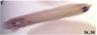 tbx6r ( T-box 6 related) gene expression in Xenopus laevis embryos, NF stage 30, as assayed by in situ hybridization, dorsal view, anteriorleft.