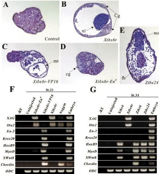 Fig. 7. Xtbx6r induces anterior neuroectodermal markers in animal cap explants. (A-E) Histological sections of animal cap explants at st.31. Injected mRNA and its doses were: (A) uninjected control, (B) Xtbx6r (200 pg), (C) Xtbx6r-VP16 (200 pg), (D) Xtbx6r-EnR (200 pg), (E) Ztbx24 (200 pg). Cg, cement gland; fg, fibroblast; nl, neural-like tissue; ms, muscle; mt, mesothelium. (F-G) Animal cap explants were analyzed at st.23 (F) and at stage 31 (G) by RT-PCR. Injected mRNA and its doses were: (F) Xtbx6r (200 pg), Xtbx6r-EnR, Xtbx6r-VP16 and noggin (100 pg, respectively). (G) Xtbx6, Xtbx6r, Ztbx6 and Ztbx24 (200 pg, respectively).