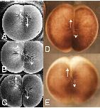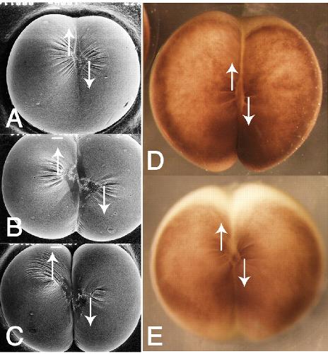 Fig. 2. Normal first cleavage in Xenopus is chiral and not mirror-image symmetric. Both fixed (A-C) and live (D-E) embryos, untreated, reveal a slight counterclockwise torsion of the two blastomeres during cleavage furrow advance. The apex of each furrow margin, i.e. the site at which furrowing began, becomes offset relative to the corresponding point in the opposite blastomere (arrow bases). By midcleavage (C), the offset between devitellinated blastomeres may be as much as 150 μm. Although the asymmetry is accentuated by dejellying (D) or removal of the vitelline envelope, even embryos with undisturbed jelly coats (E) display the same chirality. The offset normally becomes obscured as cleavage proceeds and the stress folds relax.