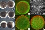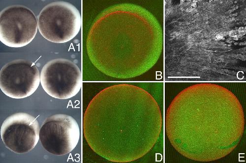 Fig. 11. Cortical f-actin in the dorsal marginal zone reorganizes to form a contractile equatorial band following BDM treatment. (A) Embryos were exposed to 20 mmol/l BDM beginning at 55 minutes post-fertilization and fixed 5, 10 and 20 minutes later (60, 65, 70 minutes post-fertilization; A1-A3, respectively). Each develops a horizontal sulcus, indicating surface contraction, on the side opposite the SEP (prospective dorsal marginal zone) (arrows in A2, A3). (B) Phalloidin-stained zygote, fixed at 75 minutes (20 minutes after BDM exposure) viewed in whole-mount via confocal microscopy; same orientation as zygotes in A. Rhodamine-phalloidin (red) stains equatorial sulcus brightly. Green reflection mode provides background, primarily to indicate that cortical pigment is not obscuring the view of cortical actin. (C) Detail of the surface at the edge of the sulcus, showing equatorially aligned microfilaments. Scale bar: 60 μm. (D,E) Animal and vegetal surfaces, respectively, of untreated zygote, fixed 75 minutes post-fertilization and stained with rhodamine-phalloidin, showing enrichment of cortical f-actin on the dorsal marginal zone.