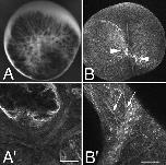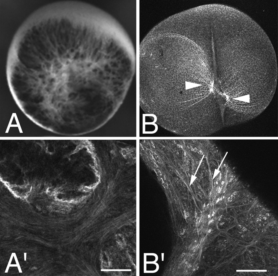 Fig. 3. Microfilaments bundle ectopically in cortex following BDM treatment.Xenopus zygotes were exposed to 20 mmol/l BDM beginning at 0.38 NT (A) or 0.94 NT (B) after fertilization. The earlier BDM exposure caused extensive contraction and irregular blebbing in the animal cap (A). Rhodamine-phalloidin staining of the surface, showing long, branching ectopic microfilament bundles (Aâ²). The later BDM exposure induced torsion between the two cleaving blastomeres (offset indicated by paired arrowheads in B) and extensive bundling of ectopic actin fibers that branched and spread across cortex from the growing edge of the contractile ring (arrows in Bâ²). Scale bars: 10 μm in Aâ²; 75 μm in B.