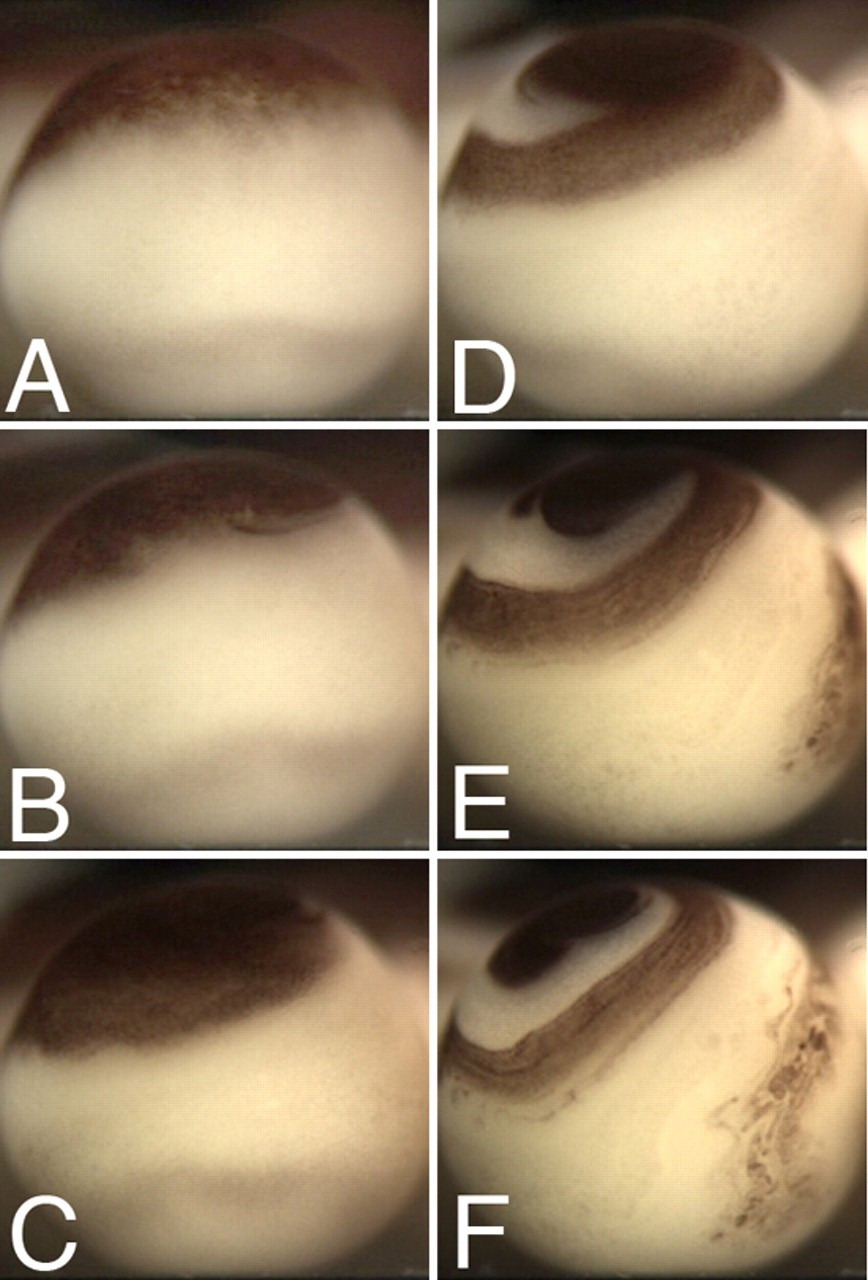 Fig. 4. Cortical torsion occurs in parthenogenetically activated eggs. (A-F) Eggs were parthenogenetically activated and, from 75 minutes post-activation (â¼0.79 NT) onward, bathed continuously in 20 mmol/l BDM. Activated egg, viewed from the side through two cleavage cycle equivalents (frames approximately 10 minutes apart), developed a spiraled pigment pattern in the animal hemisphere as the surface rotated left to right (counterclockwise).