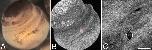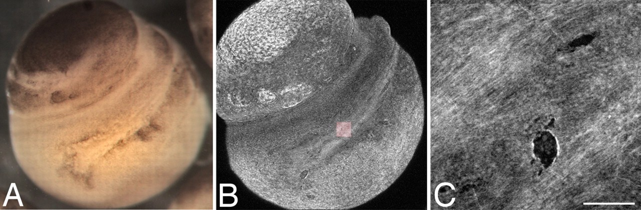 Fig. 7. Long microfilament bundles parallel the equatorial shear. A parthenogenetically activated egg treated with BDM/nocodazole observed to be undergoing torsion (A) was fixed and stained with rhodamine-phalloidin and examined via confocal microscopy (B). Bundles of cortical microfilaments parallel the direction of shear in the equatorial region. The region indicated by the colorized box is shown at higher magnification (C). A small post-fixation tear in the surface (dark spot) reveals relatively little organized f-actin beneath the cortex. Scale bar in C: 30μ m.