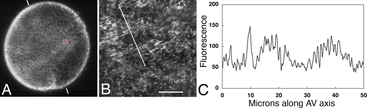 Fig. 8. Cortical microfilament bundles slide past each other, paralleling the direction of shear. (A) Equatorial view via confocal microscopy of an egg matured from an oocyte injected with GFP-actin mRNA. The egg was parthenogenetically activated and incubated in BDM/nocodazole. White bars indicate the orientation of the animal-vegetal axis. (B) The colorized region is examined at higher magnification, showing GFP-decorated microfilaments oriented in a band paralleling the equator. (C) The fluorescence intensity profile along a white transect in B paralleling the animal-vegetal meridian. The distribution of intensity maxima indicates relatively uniform spacing of GFP-actin microfilament bundles. Scale bar in B: 15 μm.