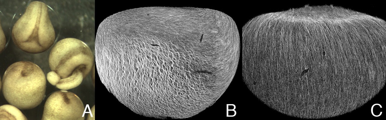Fig. 10. Hyperdorsalization results from radialized vegetal microtubule array. (A) Embryos treated with 20 mmol/l BDM for 20 minutes during the first cell cycle displayed a range of conjoined-twin and radialized hyperdorsal morphologies. (B) A normal vegetal-cortical microtubule array, seen from the side in a whole-mount embryo immunostained forαβ -tubulin via confocal microscopy. The specimen is oriented with the animal pole up, sperm entry point to the right, and thus prospective dorsal to the left. (C) A vegetal-cortical microtubule array in a BDM-treated sibling displaying the extreme hyperdorsal phenotypes seen in A. The specimen orientation is the same as that for B.