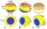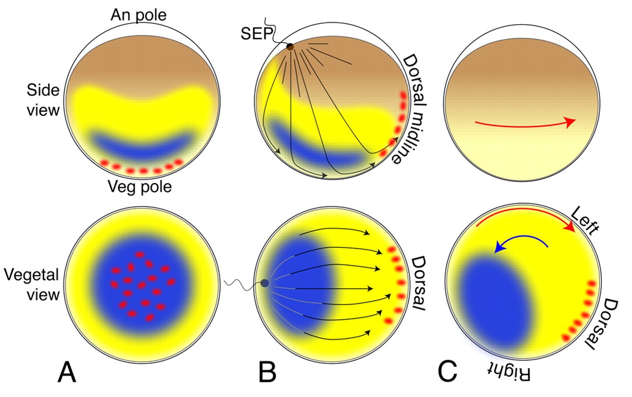 Fig. 12. Symmetry breaking accompanies DV axis specification during the first cell cycle. Top: side view. Bottom: vegetal view. (A) Before fertilization, deep (blue) and shallow (red) determinants are localized concentrically about the animal-vegetal axis. (B) After fertilization, the spermcentrosome initiates orientation of the vegetal-cortical microtubule array, producing a shift of dorsalizing components toward the incipient dorsal marginal zone, and a concomitant shift of deeper components and the yolk mass (yellow) toward the sperm entry point. The axial separation of the deep and shallow components defines the plane of bilateral symmetry. (C) An actin-dependent shift of surface counterclockwise relative to the deeper components produces significant material differences across the embryonic midline.