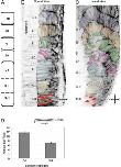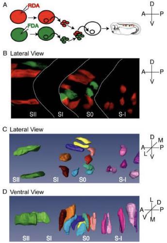 Fig. 2. Cells maintain an elongated cell shape during rotation. A: Anillustration of the transplant procedure used to obtain the images in B, C,and D. Host embryos received transplantations of rhodamine- and flu-orescein dextran-labeled cells and were allowed to develop to stage 28and then were fixed and cleared for image analysis. B: The resultingembryo exhibited a mixture of red and green fluorescent cells scatteredthroughout the paraxial mesoderm. The z-stack collected from thisimage was rendered into a three-dimensional (3-D) image using theAmira software package. C: A lateral view of the 3-D image reveals thatcells in the dorsal portion of S0 complete rotation before cells positionedin other regions of the same somite. D: A ventral view of the same imageshows that cells maintain an elongated shape as they bend toward theanterior and posterior directions during rotation.