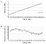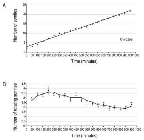 Fig. 6. Temporal differences in the formation of anterior and posterior somites. A: Graph showingthe total number of somites formed over time. An R2value of 0.9911 indicates a strong linearpattern of somite formation, and suggests that somites are added at regular time intervals(approximately 50 min) regardless of their position along the anteroposterior axis. B: Graphshowing the average number of somites in rotation at given time intervals over a 950-min timeperiod.