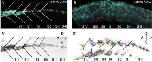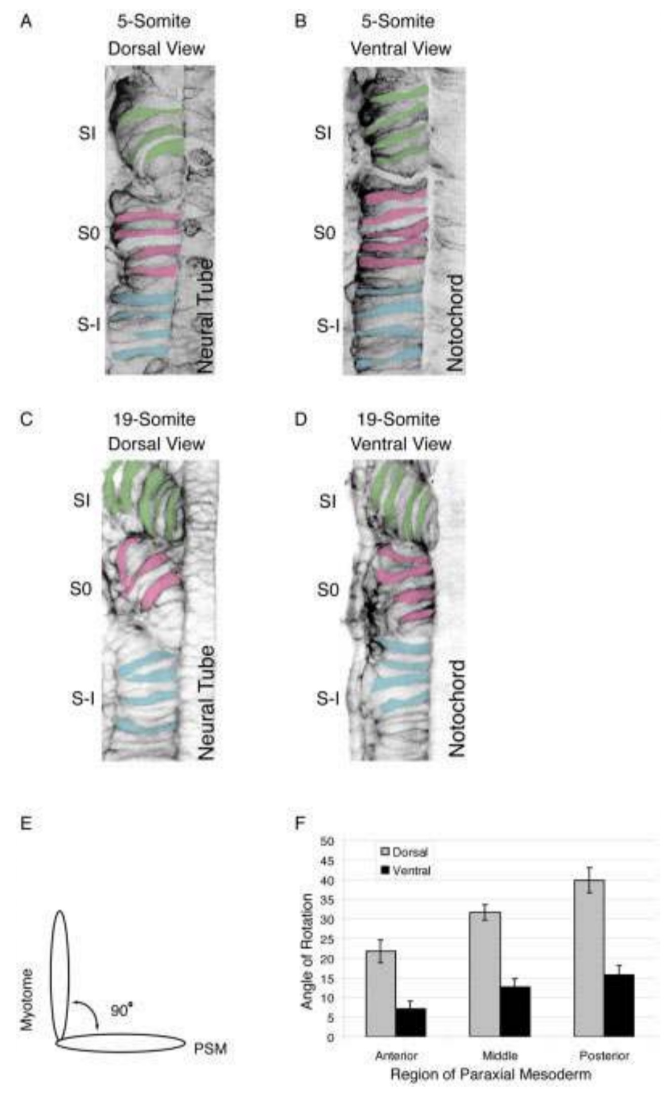Fig. 7. Somite formation occurs in a dorsal-to-ventral progression.A,B: Comparison of cell shapes between a dorsal view at the level of theneural tube (A) and a ventral view at the level of the notochord (B) in thesame fixed, cleared, and green fluorescent protein (GFP) -labeled five-somite embryo (stage 19). C,D: In an older fixed, cleared, and GFP-labeled embryo (stage 27), during the formation of the 19th somite,dorsal (C) and ventral (D) differences in cell morphology become moreapparent. E: An illustration of cell angle measurements as cells in S0rotate 90 degrees to form myotome fibers. The angle of rotation wasmeasured for cells in S0 relative to the starting position of cells in thepresomitic mesoderm (PSM; S-I). F: A graph showing the angle ofrotation for individual cells within S0 at three different axial regions of thedeveloping paraxial mesoderm: (1) anterior, consisting of embryos with4 to 6 somites; (2) middle, consisting of embryos with 9 to 12 somites;and (3) posterior, consisting of embryos with 18 to 20 somites.