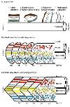 Fig. 8. Proposed four-step model for cell shape changes occurringduring somite morphogenesis. A1: Cells elongate mediolaterally in theanterior presomitic mesoderm (PSM; S-I). A2: The number of posteriorlydirected filopodial protrusions increases. A3: Elongated cells bendaround the dorsoventral axis such that the anterior cell moves to thelateral edge of the somite (shown in brown) and a more posterior cellmoves to the medial region of the somite (shown in gray). A4: Cellsachieve a parallel alignment along the anteroposterior axis. B: Theoverall pattern of somite morphogenesis occurs in a dorsal-to-ventralgradient. Colored cells indicate that movement occurs around the dor-soventral axis during somite segmentation and rotation. C: During theformation of posterior somites, rotation and formation (S0) occur simul-taneously, such that cells positioned in the dorsal (red) and middle(yellow) regions of the somite have completed rotation. Thus by the timethe somite matures to SI, almost all of the cells have completed rotation.