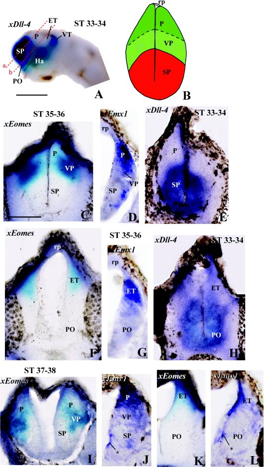 Figure 1. A: Lateral view of a whole-mount brain of a Xenopus embryo at stage 33â34, hybridized for xDll4. The red dashed lines represent the horizontal section plane and level of the sections shown in panels BâL (a, telencephalic level, similar to those shown in panels BâE and IâJ; b, section through the preoptic region [PO] and eminentia thalami [ET], similar to those shown in FâH and KâL). B: Schema of a horizontal section through the embryonic telencephalon of Xenopus showing the major telencephalic divisions based on the gene expression patterns shown in panels CâE. CâE,I,J: Horizontal sections through the telencephalon of Xenopus embryos at stages 33â34 (E), 35â36 (C,D), or 37â38 (I,J), hybridized for xEomes (C,I), xEmx1 (D,J) or xDll4 (E). Note the broad expression of xEomes in the pallium (P; in proliferating and postmitotic cells), which is complementary to that of xDll4 in the subpallium (SP; C,E). xEmx1 is also broadly expressed in the majority of the pallium, except for a ventral pallial area (ventralpallium or VP) that contains only xEmx1-expressing cells in the mantle (D, J). The ventralpallium shows the strongest xEomes expression (C,I). In addition to the expression of xEomes and xEmx1 in the pallium, signal of these genes is observed in the subpallial mantle and may represent immigrant cells coming from the pallium. FâH,K,L: Horizontal sections through the PO and ET of Xenopus embryos at stages 33â34 (H), 35â36 (F,G), or 37â38 (K,L), hybridized for xEomes (F,K), xEmx1 (G,L), or xDll4 (H). Note the strong expression of pallial marker genes in the ET and the absence of xDll4 expression in this region. Asterisks in J and L represent an artifact. See text for more details. For abbreviations , see list. Scale bars = 100 μm in A; 50 μm in C (applies to CâL).