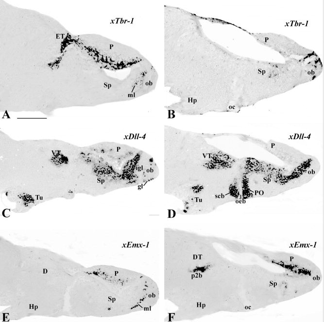 Figure 2. Sagittal sections through the forebrain of Xenopus at late embryonic stages (stage 43), hybridized from xEomes (A,B), xEmx1 (C,D), or xDll4 (E,F). Note the general expression of xEomes and xEmx1 in the pallium and developing mitral cell layer of the olfactory bulb (AâD). The ventralpallium is a pallial subdivision rich in xEomes (A) but having only scattered cells expressing xEmx1 (C). The subpallium, rich in cells expressing xDll4 (E,F), contains a few cells expressing xEomes or xEmx1 in the mantle (A,B). More caudally, the eminentia thalami (ET) appears as a distinct domain located rostrodorsal to the ventralthalamus (VT), rich in xEomes (A) but poor in xDll4 (E). Note the strong xEmx1 expression domain in the basal plate of prosomere 2 (p2b). See text for more details. For abbreviations , see list. Scale bar = 50 μm in A (applies to all).