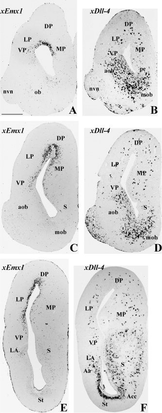 Figure 6. Frontal paraffin sections through the telencephalon of an adult Xenopus, from intermediate (top) to caudal (bottom) levels, hybridized for xEmx1 (A,C,E) or xDll4 (B,D,F). Note the strong xEmx1 expression in the majority of the pallium (specially in the dorsal and lateral divisions) except for the ventralpallium. Only a few xEmx1-expressing cells are observed in the VP mantle. In the pallium, including the ventralpallium, only some scattered mantle cells express the subpallial marker gene xDll4, and these are probably immigrant cells of subpallial origin. The caudal part of the lateral amygdalar nucleus, here called the posterolateral amygdalar nucleus (PLA), is rich in xEmx1 expression and may be a lateral pallial derivative. On the other hand, the medial amygdalar nucleus is poor in both xEmx1 and xDll4, and at least a major part of it may be a ventral pallial derivative. See text for more details. For abbreviations , see list. Scale bar = 200 μm in A (applies to all).