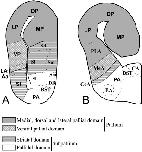 Figure 7. Schematics of frontal sections through the telencephalon of adult Xenopus, at intermediate (A) or caudal (B) levels, showing some of the major telencephalic divisions (pallium, subpallium) and subdivisions (striatum and pallidum in the subpallium; ventral pallium in the pallial domain), and the nuclei or areas included in them, as inferred from the expression patterns of several homeobox genes during development and in the adult. In frogs, the ventral pallium appears to include the postolfactory eminence (in the rostral septum), the ventral part of the classical lateral pallium, and some amygdalar nuclei, such as the lateral amygdalar nucleus (LA) and a major part of the medial amygdalar nucleus (MeA). The frog posterolateral amygdalar nucleus appears to belong to the lateral pallium. As in amniotes (Puelles et al., 2000), expression patterns of xDll4 and xNkx2.1 indicate that striatal-like and pallidal-like molecular subdivisions of the subpallium are found in the lateral telencephalic wall (including the basal ganglia and part of the amygdala) as well as in the septum of frogs (González et al., 2002a, b; Broxet al., 2003). In the subpallial amygdala, the so-called anterior and central amygdalar nuclei of frogs appear to belong to the striatal domain (Broxet al., 2003). On the other hand, a small part of the frog MeA may belong to the subpallium (maybe including a pallidal part; González et al., 2002a, b; Moreno and González, 2003). Thus, as in amniotes (Puelles et al., 2000), the amphibian amygdala appears to consist of lateral pallial, ventral pallial, striatal, and possibly pallidal subdivisions. See text for more details. For abbreviations , see list.