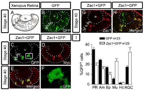 Figure 2. Misexpression of mZac1c in Xenopus retina biases progenitors to acquire retinal ganglion cell (RGC) and M�ller glial cell fates. A: Schematic illustration of a mature stage 40 Xenopus retina. B: Stage 40 control-injected retina showing green fluorescent protein (GFP) epifluorescence (green) of transfected cells. C�F: Stage 40 retina co-injected with expression constructs for GFP and myc-tagged Zac1, showing GFP epifluorescence (green, C,E,F) and immunostaining with anti-myc (red, D,E). F is a high-magnification image of the boxed area in C, showing a representative abnormal cluster of RGC layer (GCL) cells induced by Zac1. G,H: Anti-Zac1 immunostaining (red, G,H) of stage 40 Zac1+GFP (green, H) injected retina. Note that Zac1 antibody does not cross-react with Xenopus Zac1. I: Quantification of GFP+ cells corresponding to each retinal cell class, showing a significant (***P < 0.001) expansion of M�ller glial and cells in the RGC layer at the expense of most other cell types after misexpression of mZac1c. n = number of retinae analyzed, and total cell counts were 1,553 for control and 1,146 for mZac1c. Error bars are SEM. gcl, ganglion cell layer; inl, inner nuclear layer; onl, outer nuclear layer; le, lens; PR, photoreceptors; Am, amacrine cells; Bp, bipolar cells; Mu, M�ller glia; Hc, horizontal cells; RGC, retinal ganglion cells. |