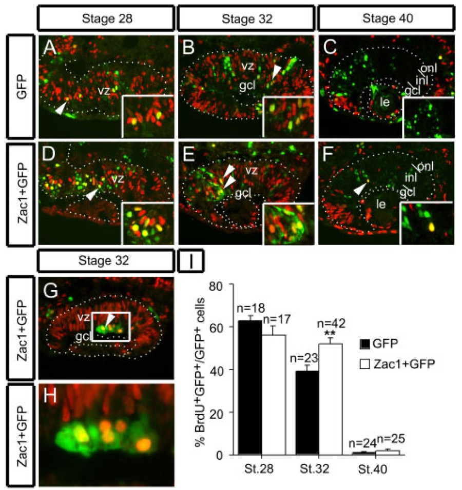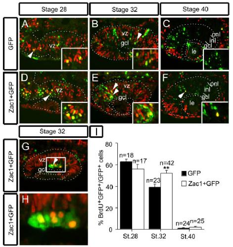 Figure 6. mZac1c promotes the proliferation of retinal progenitors at an intermediate stage of retinogenesis. A�H: Embryos injected with green fluorescent protein (GFP, green, A�C) or co-injected with Zac1+GFP (green, D�F) were exposed to a short bromodeoxyuridine (BrdU) pulse before harvesting at stage 28 (A,D), stage 32 (B,E,G,H) and stage 40 (C,F). Immunolabeling of BrdU is in red (all panels). Inserts in A�F show high-magnification images of GFP/BrdU double positive cells. Arrowheads shows BrdU (red)/GFP (green) double-positive cells in the inner nuclear layer (F) and in a retinal ganglion cell layer (GCL) cluster (the boxed area in G is shown in high magnification in H). I: Quantification of BrdU-labeling index for control and Zac1-misexpressing embryos at each developmental stage. n refers to the number of retinae examined, and total cells counted were as follows: st28: control, 507 and Zac1, 715; st 32: control, 963 and Zac1, 1,280; st 40: control, 1,524 and Zac1, 1,301. Error bars are SEM. **P < 0.01. gcl, ganglion cell layer; inl, inner nuclear layer; onl, outer nuclear layer; vz, ventricular zone. |