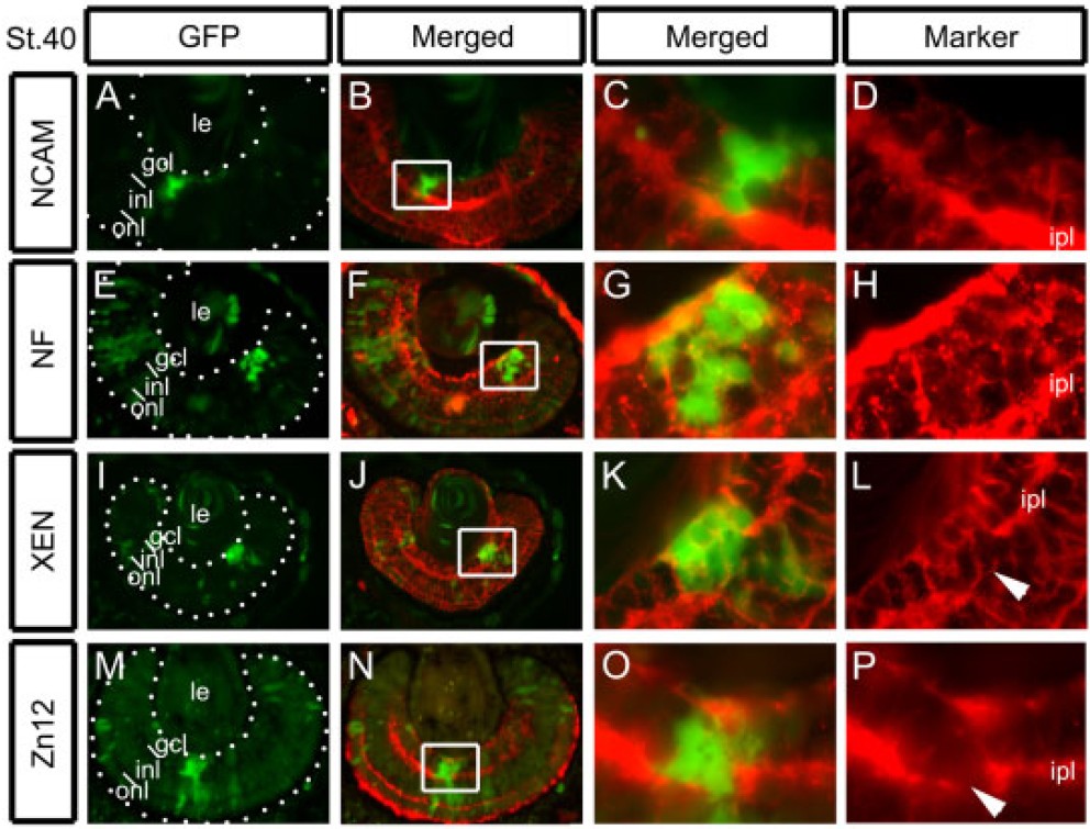 Figure 4. mZac1c-induced retinal ganglion cell layer (GCL) clusters have a neuronal identity. A�P: Stage 40 green fluorescent protein�Zac1 (GFP+Zac1) -injected retina showing GFP epifluorescence (green, A�C,E�G,I�K,M�O) and immunolabeling with the pan-neuronal markers nerve cell adhesion molecule (NCAM, red, B�D), neurofilament (NF, red, F�H), Xen-1 (red, J�L), and Zn12 (red, N�P). C�D, G�H, K�L, O�P are high-magnification images of the boxed areas in B, F, J, N, respectively. Arrowheads in L and P mark disorganized inner plexiform layer. le, lens; gcl, ganglion cell layer; inl, inner nuclear layer; ipl, inner plexiform layer; onl, outer nuclear layer. |