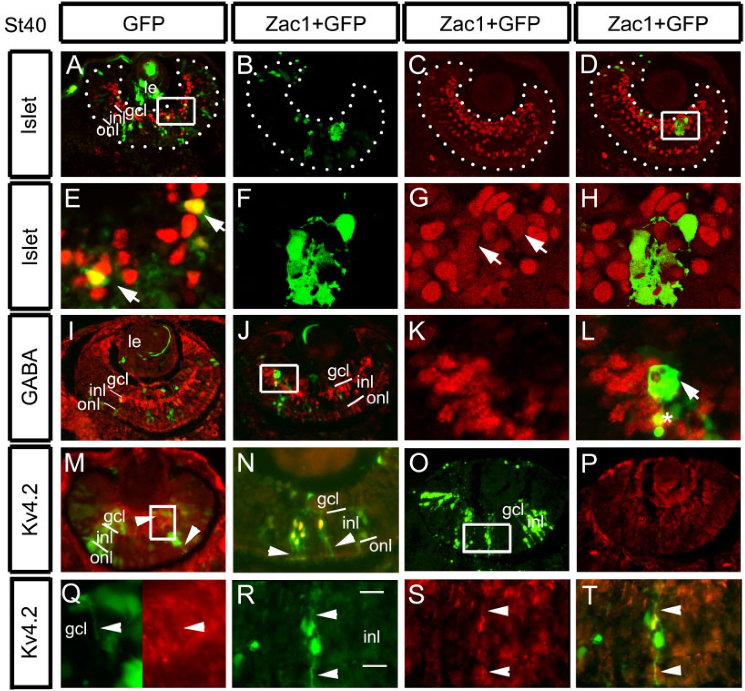 Figure 5. mZac1c perturbs the differentiation of retinal ganglion cells (RGCs) while supernumerary M�ller glia are correctly specified. A�T: Immunostaining of stage 40 control�green fluorescent protein (GFP, green, A,E,I,M,Q) and Zac1+GFP (green, B�D,F�H,J�L,N�P,R�T) co-injected retinae with the cell-type specific markers Islet (red, A�H), γ-aminobutyric acid (GABA, red, I�L), and Kv4.2 (red, M�T). E and F�H are high-magnification images of the boxed areas in A and D, respectively. Arrows in E show double GFP/islet positive RGCs, while arrows in G show Zac1-misexpressing cells in the RGC layer (GCL) express low levels of Islet. K,L are high-magnification images of the boxed area in J. Arrow in L indicates that a Zac1-induced GCL cluster does not express the amacrine cell marker GABA, while a Zac1-misexpressing cell in the inner nuclear layer (INL) does express GABA (asterisk, L). Q and R�T are high-magnification images of the boxed areas in M and O, respectively. M,N,Q�T: Arrowheads point to M�ller glia and their radial processes. Note the GFP+ M�ller glial cell clusters induced by Zac1 misexpression in N�O (arrowheads). Red label in N is myc immunoreactivity, indicating Zac1-misexpressing cells. Arrowheads in T show that Zac1-induced M�ller glial cell clusters express Kv4.2. le, lens; gcl, ganglion cell layer; inl, inner nuclear layer; onl, outer nuclear layer. |