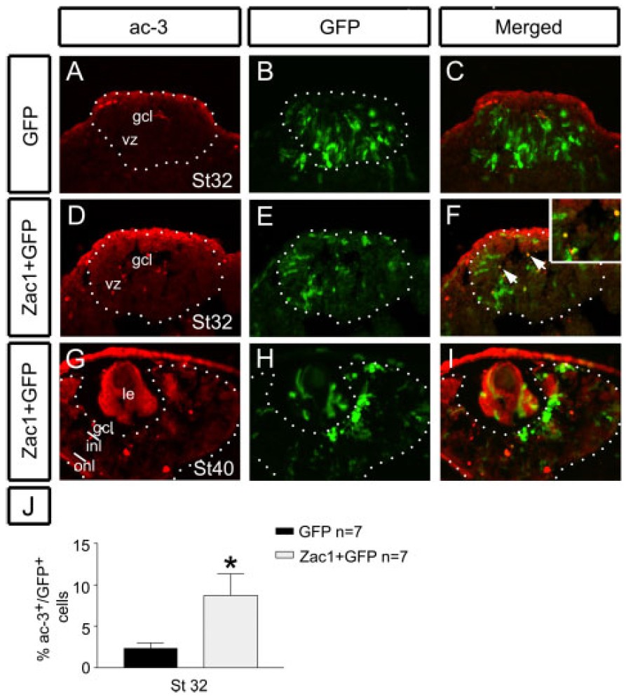 Figure 7. mZac1c promotes apoptosis in Xenopus retina at stage 32. A�F: Stage 32 control green fluorescent protein (GFP, A�C) and Zac1+GFP�injected (D�F) retinae labeled with anti�activated caspase-3 (ac-3, red, A,C,D,F) and GFP epifluorescence (green, B,C,E,F). The insert in F shows a high-magnification image, and arrowheads in F show GFP/ac-3 double positive cells. G�I: Stage 40 Zac1+GFP�injected retinae labeled with ac-3 (red, G,I) and GFP epifluorescence (green, H, I). J: Quantification of apoptotic control and Zac1-misexpressing cells in stage 32 retinae. n refers to the number of retinae examined, and total cells counted were control (n = 2,115) and Zac1 (n = 1,705). Error bars are SEM. *P < 0.05. gcl, ganglion cell layer; inl, inner nuclear layer; onl, outer nuclear layer; vz, ventricular zone. |
