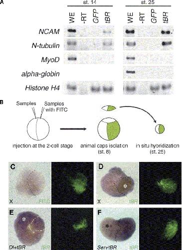 diagram illustrating the animal cap assay. Indicated RNAs or tBR RNA (2 ng) along with FITC (5 ng) was injected into the animal pole of each blastomere