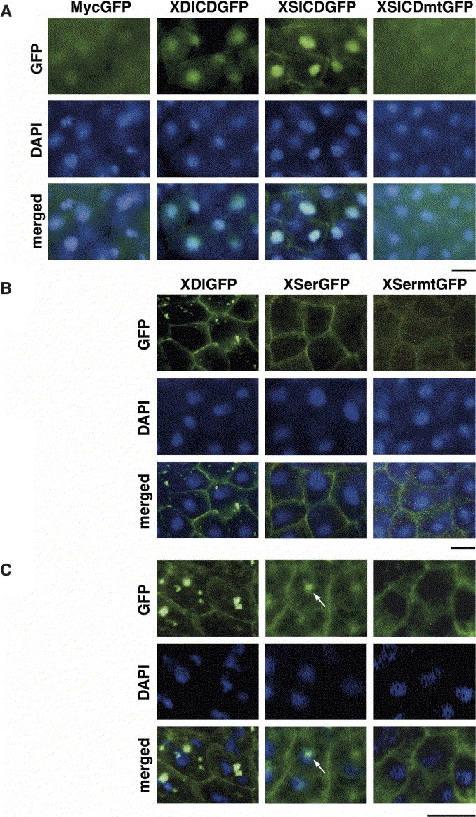 putative NLS of X-Serrate-1 are detected only on the plasma membrane at the gastrula stage. (C) XDlGFP or XSermtGFP at the neurula stage is the same as