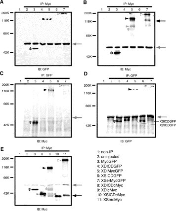 case of XDlMycGFP. (E) Immunoblot with the anti-myc antibody after immunoprecipitation with the anti-myc antibody. Note that 40, 42 and 45 kDa proteins
