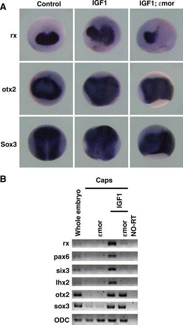 Fig. 4. B56ε is required for IGF1-induced EFTFs expression. (A) Whole mount in situ hybridization showing that εmor injection blocked IGF1-induced rx expression (upper panels), without affecting IGF1-induced otx2 (middle panels) and sox3 (lower panels) expression in whole embryos (stage 14). IGF1 (2 ng) was unilaterally injected at the 8-cell stage into either wild-type embryos, or embryos that were previously injected with 5 ng of εmor. The right side was injected. (B) RT-PCR showing εmor injection blocked IGF1-induced rx, pax6, six3, and lhx2 expression, while IGF1-induced otx2 and sox3 expressions remain unaffected. εmor (10 ng) was injected at the 1-cell stage. IGF1 (2 ng) was radially injected into the animal pole of each blastomere at the 4-cell stage. Animal caps were dissected at late blastula stage and harvested at stage 13. |
