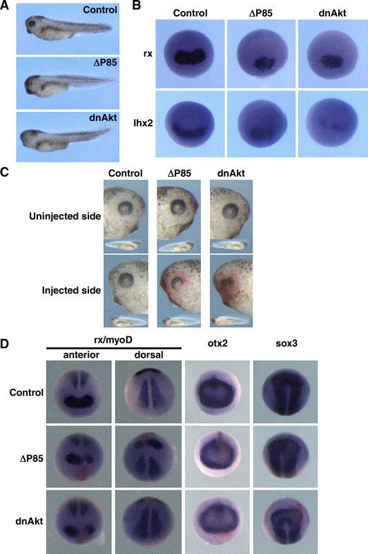 Fig. 6. The PI3K/Akt pathway is required for eye induction. (A) Injection of δp85 (2 ng) or dnAkt (2 ng) into dorsal animal blastomeres at the 8-cell stage blocked eye formation. (B) δp85 and dnAkt blocked the expression of rx (upper panels) and lhx2 (lower panels) at stage 14. (C) Injection of δp85 or dnAkt into A1 blastomere at the 32-cell stage impaired eye formation on the injected side (left) when embryos reached tadpole stage. Left side was injected. (D) Injection of δp85 (middle panels) or dnAkt (lower panels) into A1 blastomere at the 32-cell stage reduced the expression of rx, but not myoD, otx2, and sox3. n-β-gal was used as a lineage tracer. |