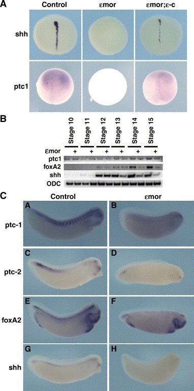 Fig. 8. B56ε is required for the expression of endogenous Hh target genes. (A) Whole mount in situ hybridization showing the expression of shh (upper panels) and ptc-1 (lower panels) was reduced by εmor (3.5 ng) injection at stage 14/15. The reduced shh and ptc-1 expression was partially rescued in embryos injected with εmor and ε-c (100 pg). (B) RT-PCR showing εmor (3.5 ng) injection reduced ptc-1, foxA2, and shh expression from late gastrula stage. ODC was the loading control. (C) The expression of ptc-1, ptc-2, foxA2, and shh in tadpole stage control embryos (left column) and embryos injected with 3.5 ng of εmor (right column). Embryos were bilaterally injected at the 8-cell stage. |