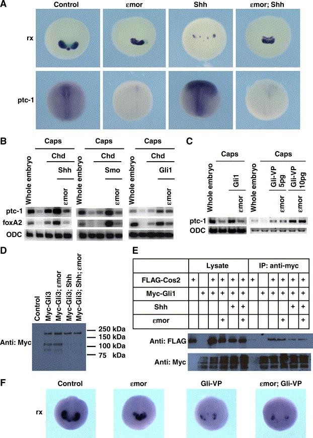 Fig. 9. B56ε is required for the Hh pathway. (A) Whole mount in situ hybridization showing εmor (3.5 ng) injection blocked Shh (1 ng)-induced rx reduction (upper panels) and ptc-1 expression (lower panels) in whole embryos. Embryos were bilaterally injected at the 8-cell stage. (B) RT-PCR showing εmor (10 ng) injection blocked ptc-1 and foxA2 induced by shh (1 ng), smo-M2 (2.5 ng), and gli1 (0.5 ng) in neuralized animal caps. εmor and RNAs were injected sequentially at the 1-cell stage. Animal caps were dissected at stage 8/9 and harvested at stage 14. (C) RT-PCR showing εmor injection (10 ng) blocked ptc-1 expression induced by wild-type Gli1 (500 pg), but not by Gli-VP (50 pg and 100 pg). Embryos were injected and manipulated as described above. (D) Western blot showing overexpression of Shh inhibited the processing of overexpressed Myc-Gli3 (0.5 ng) in animal caps. The effect of Shh (1 ng) on Myc-Gli3 processing was not affected by εmor (10 ng) injection. Embryos were injected and manipulated as described above, except that caps were harvested at stage 12. (E) Co-IP results showing overexpression of Shh (1 ng) dissociated complex formation between FLAG-Cos2 (1 ng) and Myc-Gli1 (1 ng) in animal caps. Injection of εmor (10 ng) did not affect this complex dissociation induced by Shh. Embryos were injected and manipulated as described above. (F) Whole mount in situ hybridization showing the expression of rx in (from left to right) a control embryo, an embryo injected with εmor (3.5 ng), an embryo injected with Gli-VP (100 pg), and an embryo injected with Gli-VP and εmor. Embryos were bilaterally injected at the 8-cell stage. |