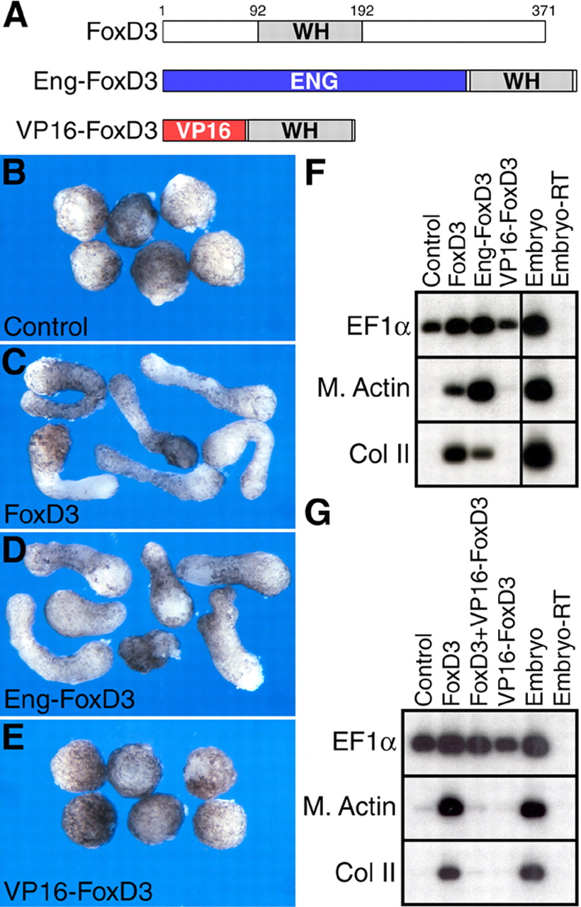 Fig 3. Functional analysis of FoxD3 fusion proteins. (A) Schematic of the structure of FoxD3 and the FoxD3 fusion proteins. FoxD3 contains a conserved winged helix (WH) DNA-binding domain (residues 92-192). The repressor fusion protein (Eng-FoxD3) contains the repressor domain of Drosophila Engrailed (residues 1-298) fused to the FoxD3 WH domain. The activator fusion protein (VP16-FoxD3) contains the activation domain of HSV VP16 (residues 410-490). Embryos were injected with FoxD3 (100 pg), Eng-FoxD3 (100 pg) or VP16-FoxD3 (250 pg) and animal explants were analyzed at the tailbud stage (stage 25) for morphogenesis (B-E) and by RT-PCR for the expression of Muscle Actin (M. Actin) and Collagen Type II (Col II) (F). Like FoxD3, Eng-FoxD3 induced convergent extension movements and mesodermal gene expression, whereas VP16-FoxD3 did not. (G) Co-expression of VP16-FoxD3 and FoxD3 blocked induction of mesodermal genes by FoxD3. PCR controls are as described in Fig. 2. |