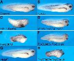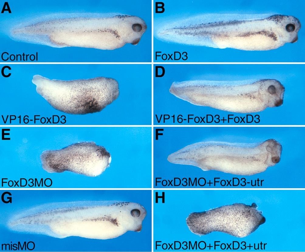 Fig. S4. FoxD3 rescue of axis formation in embryos injected with VP16-FoxD3 or FoxD3MO. The inhibition of axis formation by VP16-FoxD3 and FoxD3MO is predicted to result from a specific block of endogenous FoxD3 function. To determine the specificity of FoxD3 inhibition, FoxD3 was co-injected with VP16-FoxD3 or FoxD3MO in an attempt to rescue axis formation. At the four-cell stage, both dorsal blastomeres were injected with VP16-FoxD3 or FoxD3MO alone, or in combination with FoxD3 RNA, and axis formation was assessed at the tadpole stage. Whereas the majority of VP16-FoxD3-injected embryos had severe axial defects, only a minority displayed defects with FoxD3 co-injection (C,D). Similarly, the axial defects caused by FoxD3MO were rescued by FoxD3 RNA lacking the antisense target sequence (FoxD3-utr), but not by FoxD3 RNA containing the target sequence (FoxD3+utr) (E,F,H). As controls, injection of both dorsal blastomeres with FoxD3 RNA alone (B) or mismatch MO (G) did not perturb axis formation, by comparison with control (A). See Table 1 for quantification. |