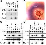 Fig. S1. FoxD3 expression in the Spemann Organizer. Whole-mount in-situ hybridization analysis of FoxD3 at gastrula stages. Vegetal views (dorsal up) of early gastrula (stage 10.25) (A) and mid-gastrula (stage 11.5) (B) embryos are shown. FoxD3 mRNA is expressed in the Spemann Organizer domain of the dorsal marginal zone that converges to the midline and extends along the AP axis during gastrulation. Whole-mount immunocytochemistry analysis of the FoxD3 protein in the gastrula using an affinity-purified anti-Xenopus FoxD3 polyclonal antibody. High-magnification views of the dorsal marginal zone (C) and the ventral marginal zone (D) of a cleared mid-gastrula embryo (stage 11) are shown (animal up). FoxD3 protein is detected in the nuclei of cells of the Spemann Organizer domain, but not in ventral cells. (E) Onset of endogenous FoxD3 expression at the gastrula stage as shown by RT-PCR analysis of Xenopus embryos at the indicated stages. Numerical stage, as defined by Nieuwkoop and Faber (Nieuwkoop and Faber, 1967), is indicated in parentheses. EF1α is a control for RNA recovery and loading. Intact embryos (Embryo) served as a positive control and an identical reaction without reverse transcriptase controlled for PCR contamination (Embryo-RT). |