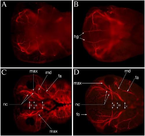 Cranial nerves in Xenopus embryo, at NF stage 48. B: Ventral view, D:Dorsal view on wildâtype embryo.