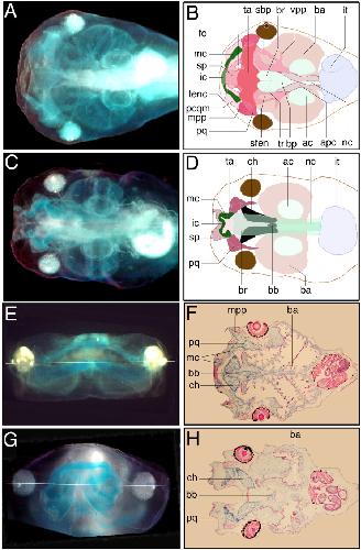 Key: ac, auditory cap; apc, anterior parachordal cartilage; ba, branchial [pharyngeal] arches; bb, basobranchiale; br, brain; ch, ceratohyale; fo, foramen olfactorium; ic, infrarostal cartilage; it, intestine; mc, Meckel's cartilage; mpp, muscular process of palatoquadrate; nc, notochord; pcqm, processus cornu quadratus medialis; pq, palatoquadrate; sbp, subocular bars of the palatoquadrate; sfen, subocular fenestra; sp, suprarostral plate; ta, tectum anterius; tr, trabecula; tenc, tentacular cartilage; vpp, ventrolateral process of palatoquadrate. |