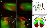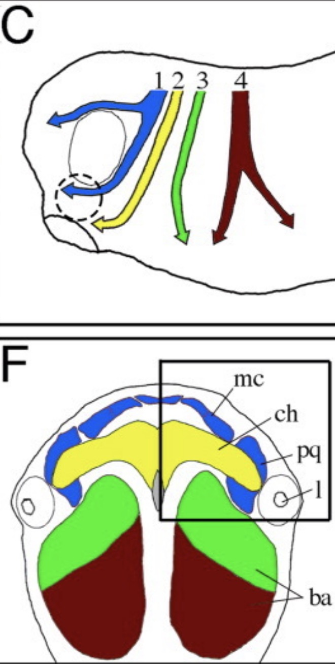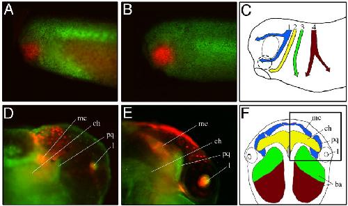 Schematic representation of cranial neural crest cell migration pathways during embryogenesis (C) at stage 26, and (F) tissue to which they contribute. Cartilage structures (ventral view) at stage 48 (modified from: Sadaghiani and Thiebaud, 1987; Baltzinger et al., 2005). The rectangle in F denotes the area seen in D and E. 1, mandibular arch (blue); 2, hyoid arch (yellow); 3, anterior branchial arch (green); 4, posterior branchial arch (brown). ba, branchial arch; ch, ceratohyale; l, lens; mc, Meckel's cartilage; pq, palatoquadrate. Image extracted from Figure 7, XB-ART-34864. |