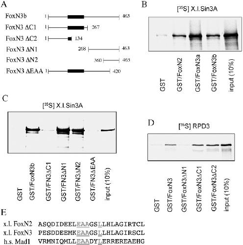 Figure 9. FoxN3 interacts with components of the histone deacetylase complex (HDAC). A: Scheme of FoxN3 deletion constructs used for GST‐pull down assays. The fork head/winged helix domain is indicated by a black box. B: [35S] methionine‐labeled Sin3 protein was incubated with GST‐fusions of the two isoforms of FoxN3 or with GST‐FoxN2, respectively. The pull‐down reactions were analysed using a 10% SDS‐PAGE. C: Pull‐down analysis of GST‐FoxN3 deletion mutants with [35S] methionine‐labeled Sin3 protein. Sin3 requires for binding the C‐terminus of FoxN3 but not the N‐terminus. D: [35S] methionine‐labeled RPD3 protein was incubated with GST‐FoxN3 mutants. RPD3 binds to N‐terminal, but not to C‐terminal region of FoxN3 deletion constructs. E: Alignment of putative Sin3 binding sites of FoxN2, FoxN3, and human Mad1 (see: van Ingen et al., 2004). Conserved amino acids are underlined and shown in grey. |