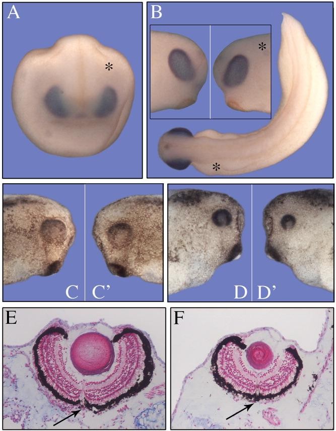 Figure 3. Analysis of the FoxN3 small eye phenotype. Thirteen nanograms of FoxN3-MO were co-injected with 200 pg GFP RNA in one blastomere at 2-cell stage. Asterisks denote the injected side. A,B: Whole mount in situ hybridization of unilaterally FoxN3-MO-injected embryos showing xRx staining in the eye field. A: Frontal view of a stage-16 embryo. B: Dorsal view of a stage-30 embryo. The insert shows a magnification of the right and left eye. No difference in xRx expression between injected and uninjected side is noted. C,C': Comparison of the injected (FoxN3-MO) and uninjected side of an embryo at stage 35. C' shows the injected side. No difference in the size of the forming eyes is observed. D,D': Right and left view of an unilaterally injected embryo, stage 39. D' shows the injected side. The eye at the FoxN3-MO injected side is clearly reduced in comparison to the uninjected side. E, F: Sections of Alcian blue-stained eyes of the uninjected control side (E) and the FoxN3-MO-injected side (F) of an embryo at stage 48. F: The eye is smaller but shows a normal structure. The different layers of the retina are clearly visible indicating that the differentiation of the retina is not affected by FoxN3-MO injection. The black arrows denote the optic nerve, indicating identical planes of section in E and F. |