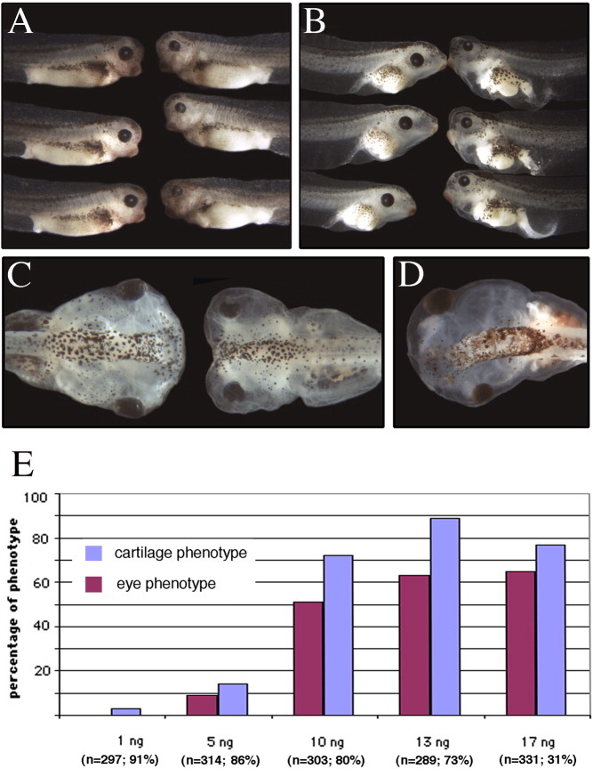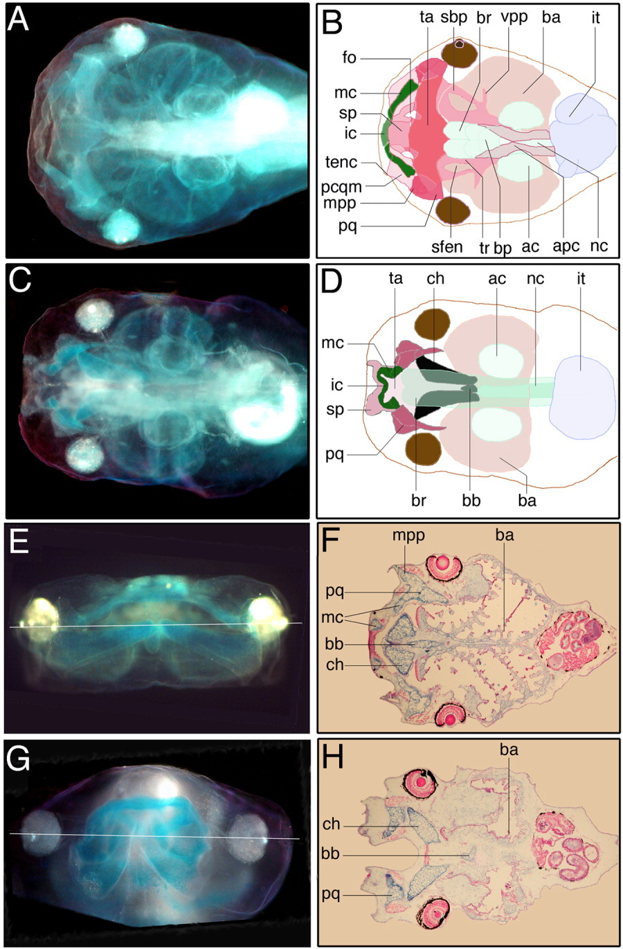 Cranial structures in Xenopus. E. Frontal view and F. section of Alcian blueâstained section through head of wildâtype Xenopus embryo at NF stage 48.