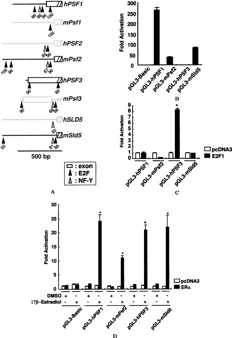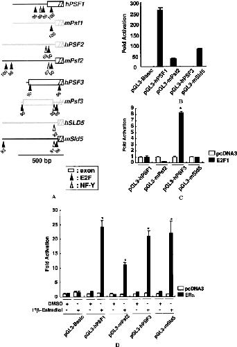 Fig. 2. Transcriptional regulation of the human and mouse GINS genes. A. Schematic representation of the vicinity of the transcription start sites of the human and mouse GINS genes. The putative transcription factor E2F- (closed isosceles triangles) and NF-Y-binding sites (open isosceles triangles) are indicated with their scores (maximum score 100) calculated by the Transfac program. Exon 1 (open boxes) is indicated. Scale bar equals 500 bp. B. Human and mouse GINS promoter activities in asynchronously growing human cells. HeLa cells were transfected with 200 ng of reporter constructs and 400 ng of the expression vector for E2F1, together with 0.6 ng of pRL-TK. The pcDNA3 vector was used as the negative control. At 48 h after the transfection, the cells were harvested, and extracts were prepared to measure the firefly and Renilla luciferase activities. Values are represented as relative luciferase activities, with that of pGL3-Basic being taken as 1. C. The E2F-binding motif of the PSF3 promoter is sufficient to confer responses to ectopic E2F expression. The experiment was performed as described in panel B. Values are represented as relative luciferase activities, with that of the control vector pcDNA3 being taken as 1. Statistically significant (P < 0.05) induction is indicated by an asterisk. D. E2-induced activation of GINS promoter constructs in HeLa cells. Cells were transfected with the indicated reporter plasmids and pcDNA3 or pSG5-ERα expression vector, and the effects of E2 or DMSO on the luciferase activities were determined. Results are expressed as mean±S.D. for at least three triplicate determinations for each treatment group. Statistically significant (P < 0.05) induction is indicated by an asterisk.