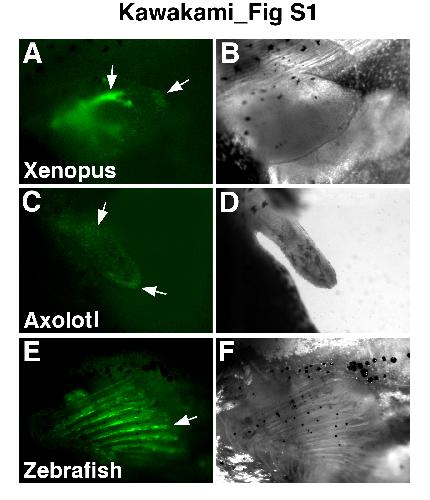 Dark field (A, C, E) and bright field (B, D, F) images of the Xenopus larvae hindlimb (A, B), axolotl larvae forelimb (C, D) and adult zebrafish pectoral fin (E, F). Fluorescent image of a Xenopus hindlimb bud 3 days after amputation and injection of Ad-eGFP at stage 52 (A). Fluorescent image of an axolotl larvae forelimb 1 day after amputation and injection of Ad-eGFP (C). Fluorescent image of an adult zebrafish pectoral fin 1 day after amputation and injection of Ad-eGFP (E). Arrows indicate fluorescent signal by Ad-eGFP.