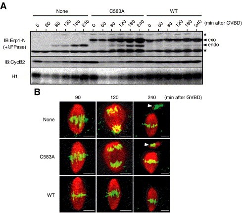 Fig. 4. Meta-I arrest by premature, ectopic expression of Erp1. (A) Inhibition of cyclin B2 degradation and Cdc2 inactivation after GVBD by premature, ectopic expression of Erp1. Immature oocytes were left uninjected (None) or injected with 1.2 ng of either Myc3-Erp1WT (WT) or Myc3-Erp1C583A (C583A) mRNAs, cultured overnight, treated with progesterone and processed as in Fig. 3E. Under these experimental conditions, both Erp1WT and Erp1C583A proteins were produced at endogenous Meta-II levels in oocytes undergoing GVBD (or MI) due to the leaky translation of the injected mRNA (see Fig. 2). (B) Spindle morphology in oocytes expressing ectopic Erp1. Oocytes expressing either Myc3-Erp1WT or Myc3-Erp1C583A as in panel A were subjected to immunostaining and DNA staining as in Fig. 3C. Note that Meta-I chromosomal configurations are maintained even long after GVBD only in oocytes expressing Erp1WT. The arrowhead shows a first polar body. Scale bar, 10 μm.
