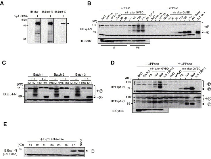 Fig. 1. Expression pattern of Erp1 during oocyte maturation. (A) In vitro translation of Erp1 mRNA. Reticulocyte lysates incubated with (+) or without (â) Myc3-Erp1 mRNA were immunoblotted (IB) with the indicated antibodies. The arrowhead shows Myc3-Erp1 protein. (B) Expression of endogenous Erp1 protein during oocyte maturation. Immature oocytes (IMO) were treated with progesterone (PG) and, at the indicated times, oocytes were collected. Oocyte extracts were treated (+) or not (â) with λ phosphatase (λ PPase) and subjected to immunoblotting with the indicated antibodies. GVBD occurred about 3 h after PG treatment. The periods of MI and MII are indicated. Heterogeneously hyperphosphorylated Erp1 proteins are shown by + â, and dephosphorylated Erp1 protein is shown by â â. Asterisked bands denote background proteins. Act, calcium ionophore-activated egg; IVT, in vitro translated Erp1 (with no tag). (C) Extracts from immature (IMO) or mature (MO) oocytes of three different batches were treated or not with λ phosphatase and immunoblotted with anti-Erp1-N antibody. See B for + â, â â and asterisks. (D) Detection of Erp1 with anti-Erp1-C antibody. Oocytes were processed and analyzed as in B, except that they were also analyzed with anti-Erp1-C antibody. (E) Inhibition of Erp1 synthesis by antisense oligonucleotides. Immature oocytes were injected with 55 ng/oocyte each of the seven Erp1 conventional (or nonmodified) antisense oligonucleotides, cultured overnight, treated with progesterone and, 4 h after GVBD, subjected to immunoblotting with anti-Erp1-N antibody (after λ phosphatase treatment of oocyte extracts). For the respective antisense oligonucleotides (#1â¼#7), see Materials and methods. Note that most of the antisense oligonucleotides specifically blocked the synthesis of endogenous Erp1. â â, (dephosphorylated) Erp1; asterisk, background protein.