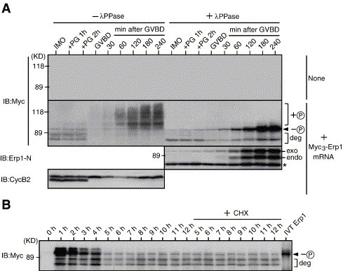 Fig. 2. Expression pattern of ectopic Erp1. (A) Immature oocytes were left uninjected (None) or injected with 100 pg of Myc3-Erp1C583A mRNA with a full-length 3â²UTR (+ Myc3-Erp1 mRNA), cultured overnight, treated with progesterone and collected at the indicated times. Oocyte extracts were treated or not with λ phosphatase and immunoblotted with the indicated antibodies. The asterisk and deg denote background protein and Myc3-Erp1C583A degradation products, respectively. + â , hyperphosphorylated Myc3-Erp1; â â, dephosphorylated Myc3-Erp1. exo, Myc3-Erp1C583A; endo, endogenous Erp1. (B) Immature oocytes were injected with Myc3-Erp1C583A mRNA as in panel A, subsequently collected at the indicated times (after the mRNA injection) and subjected to immunoblotting with anti-Myc antibody. Oocytes treated with the protein synthesis inhibitor cycloheximide (CHX; 200 μg/ml) after 5 h of mRNA injection as well as in vitro translated (IVT; unphosphorylated) Myc3-Erp1C583A protein were analyzed similarly. Note that Erp1C583A protein was transiently synthesized within 1 h of mRNA injection, largely degraded within the next 1 h and then persisted stably (see CHX treatment) until at least 12 h of mRNA injection. This result indicates that the ectopic Erp1C583A protein (and its degradation products) detected in immature oocytes and maturing oocytes before GVBD (see panel A) was derived from the one that had been transiently and leakily synthesized immediately after injection of the mRNA. â â, (nonphosphorylated) Myc3-Erp1C583A; deg, Myc3-Erp1C583A degradation products.