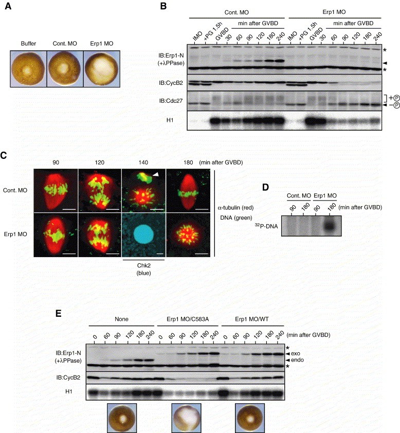 Fig. 3. Requirement of Erp1 for the MI/MII transition. (A) External morphology of Erp1 MO-treated oocytes. Immature oocytes were injected with buffer, control Erp1 sense MO (Cont. MO) or Erp1 antisense MO (Erp1 MO), cultured overnight, treated with progesterone and photographed 3 h after GVBD. See Materials and methods for details of MOs and their concentrations used. (B) Effects of Erp1 MO on cyclin B2 reaccumulation and Cdc2 reactivation after MI. Immature oocytes injected with MOs and processed as in panel A were collected at the indicated times and then subjected to immunoblotting with anti-Erp1-N antibody (after treatment of oocyte extracts with λ phosphatase) or anti-cyclin B2 or anti-Cdc27 antibodies; they were also subjected to H1 kinase assays of Cdc2 activity (H1). The arrowhead shows (dephosphorylated) Erp1, while the asterisk shows background proteins. + â and â â denote hyperphosphorylated and nonphosphorylated Cdc27 proteins, respectively. (C) Immunostaining and DNA staining of Erp1 MO-treated oocytes. Oocytes treated as in panel B were immunostained with either anti-α-tubulin antibody (red) or anti-Chk2 antibody (blue) and also stained for DNA with Hoechst 33342 (green), at the indicated times. The white arrowhead shows a first polar body. Scale bar, 10 μm. (D) DNA synthesis in Erp1 MO-treated oocytes. Immature oocytes injected with control MO or Erp1 MO were cultured overnight, injected with [α-32P]dCTP and treated with progesterone. At the indicated times, DNA was extracted from the oocytes and analyzed by agarose gel electrophoresis and autoradiography. (E) Rescue of cyclin B2 reaccumulation and Cdc2 reactivation by ectopic expression of Erp1. Immature oocytes were left uninjected (None) or injected with Erp1 MO together with 100 pg of MO-resistant Myc3-Erp1WT (WT) or Myc3-Erp1C583A (C583A) mRNAs and then processed as in panel B. For MO-resistant Erp1 mRNAs, see Materials and methods. The bottom panels show the external morphology of the respective oocytes 4 h after GVBD. exo, Myc3-Erp1WT or Myc3-Erp1C583A; endo, endogenous Erp1.