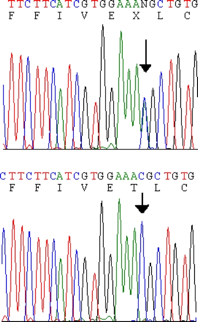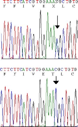 Fig. 2. Sequence chromatograms demonstrating c.676C>A resulting in T226K substitution in KCNA1. A DNA sequence from an affected patient (I-2) heterozygous for the mutation (top) and from a normal control (bottom) are presented