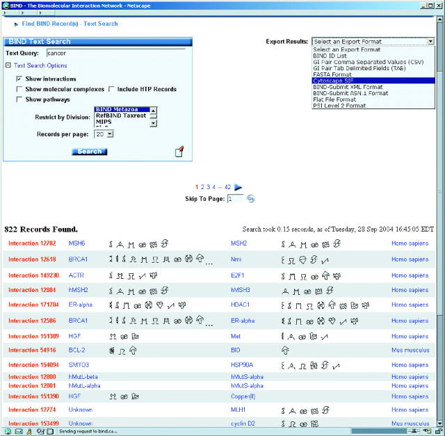 The Biomolecular Interaction Network Database (BIND) (http://bind.ca) archives biomolecular interaction, reaction, complex and pathway information. Our aim is to curate the details about molecular interactions that arise from published experimental research and to provide this information, as well as tools to enable data analysis, freely to researchers worldwide. BIND data are curated into a comprehensive machine-readable archive of computable information and provides users with methods to discover interactions and molecular mechanisms. BIND has worked to develop new methods for visualization that amplify the underlying annotation of genes and proteins to facilitate the study of molecular interaction networks. BIND has maintained an open database policy since its inception in 1999. Data growth has proceeded at a tremendous rate, approaching over 100 000 records. New services provided include a new BIND Query and Submission interface, a Standard Object Access Protocol service and the Small Molecule Interaction Database (http://smid.blueprint.org) that allows users to determine probable small molecule binding sites of new sequences and examine conserved binding residues.