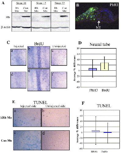 Fig. 2. XRb morpholino specifically depletes XRb protein but does not affect the number of cells in mitosis or S phase in the neural tube, or the number of cells undergoing apoptosis or S phase in the epidermis. (A) Embryos were injected with 20 ng XRb morpholino (Mo) or control Mo in both blastomeres at the two-cell stage. Extracts made from these embryos at stages 10, 15 and 22 were Western blotted and probed with anti-Rb antibody (XZ160). The same blot was stripped and probed with an anti-β-actin antibody to show equal loading. XRb Mo depletes XRb protein at all three stages, while control Mo does not affect its level. (B) Embryos were injected with 20 ng XRb Mo and β-galactosidase as a tracer (visible as green autofluorescence) in one dorsal cell at the four-cell stage. At stage 21, embryos were sectioned and immunostained using an anti-phospho histone H3 antibody to visualise mitotic cells (red fluorescence) in the neural tube (NT). Hoechst staining of nuclei (blue). (C) Embryos were injected in one cell at the two-cell stage with 20 ng XRb Mo (CaâCc) or control Mo (CdâCf) and β-galactosidase as a tracer (blue) and then injected with BrdU at stage 20. After 2 h they were fixed and epidermal cells in S phase were visualised by whole mount BrdU immunostaining (purple). There is no difference between the density of cells in S phase in the Mo-injected sides of the embryos (Ca and Cd) and their density in the uninjected sides of the same representative embryos (Cc and Cf). Dorsal views with injected sides on the left and uninjected sides on the right (Cb and Ce). (D) Embryos were injected with 20 ng XRb Mo, with or without subsequent BrdU injection (as in C), sectioned and immunostained with anti-phospho histone H3 or anti-BrdU antibody. The numbers of cells in mitosis or S phase in both injected and uninjected sides of the neural tubes were counted in serial sections (n = 6 embryos for each marker, average of 41 sections per embryo). Average percentage differences between the sides are shown, with error bars showing the standard errors. pXRb depletion results in no significant change in the number of mitotic cells on the injected side of the neural tube compared to the uninjected side (average 8% increase, p = 0.2), or in the number of cells in S phase (average 28% increase, p = 0.43). (E) Embryos injected with 20 ng XRb Mo (Ea and Eb) or control Mo (Ec and Ed) with β-galactosidase as a tracer (blue) in one cell at the two-cell stage were fixed at stage 22. Apoptotic cells in the epidermis were visualised by whole mount TUNEL staining (purple). (F) The numbers of TUNEL-stained cells were counted in sample areas on both the Mo-injected and uninjected sides. Average percentage differences between the sides are shown, with error bars showing the standard errors. Neither XRb Mo (p = 0.44; n = 10) nor control Mo injection (p = 0.1; n = 11) affects the number of apoptotic cells in the epidermis (cf. injected sides, Ea and Ec, with uninjected sides, Eb and Ed).