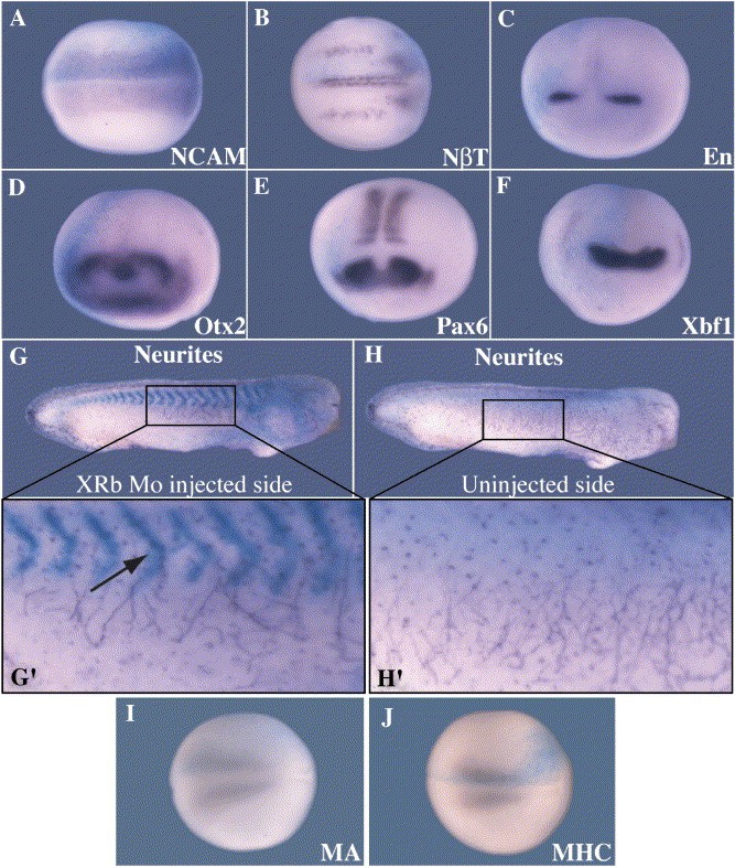 Fig. 3. Depletion of XRb protein does not affect neural or muscle differentiation. Embryos were injected in one blastomere at the two-cell stage with 20 ng XRb Mo with β-galactosidase as a lineage tracer (blue). (AâH) Expression of a range of markers of neural differentiation was examined by in situ hybridisation (stained in purple) at stage 15. NCAM (A); neural β-tubulin (B); Engrailed (C); Otx2 (D); Pax6 (E); Xbf1 (F). Neurite outgrowth was examined by immunostaining for neural β-tubulin at stage 28: XRb Mo-injected side (G) and uninjected side (H) of the same embryo; magnified views of the neurites of the same embryo (Gâ² and Hâ²). Arrow indicates normal structure of XRb Mo-injected somites (Gâ²). pXRb depletion does not alter the expression patterns of any of these markers. (I, J) Expression of the markers of muscle differentiation muscle actin (I) and myosin heavy chain (J) was visualised by in situ hybridisation (purple) at stage 15: they are not affected by pXRb depletion. Dorsal views; anteriors to the right; injected sides uppermost (A, B, I, J). Anterior views; injected sides to the left (C, D, E and F). Lateral views; anterior to the right (G, Gâ², H and Hâ²).